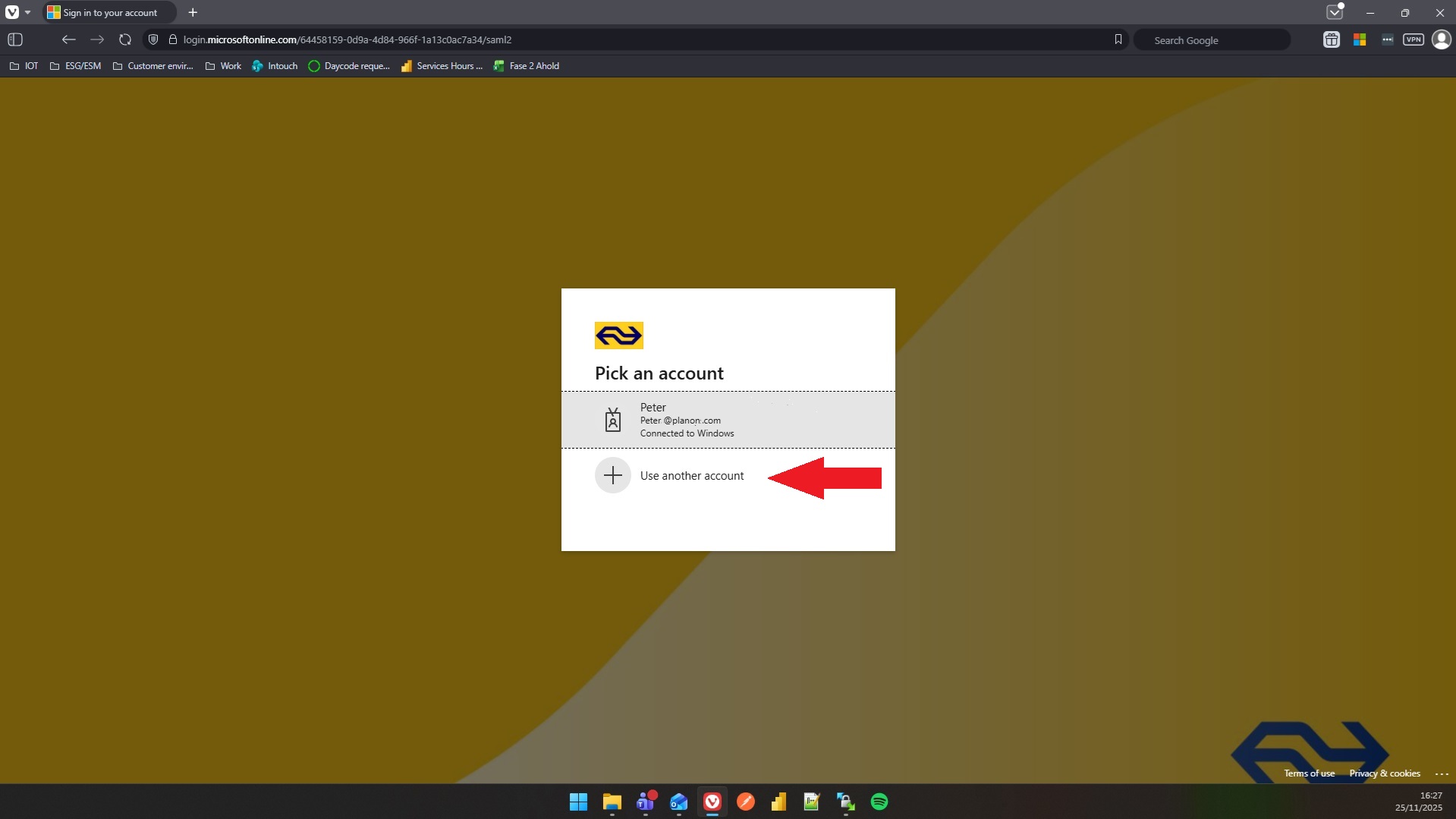 “Use another account” of "Ander account gebruiken". Gebruik dus niet je eigen organisatie-account.